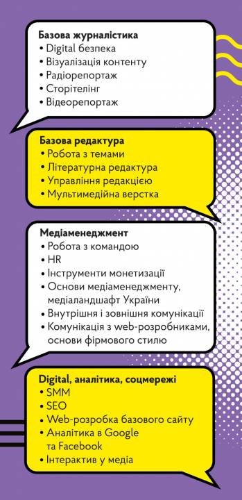 Ми рухаємося вперед, і запускаємо Школу універсальних редакторів для студентів, редакторів регіональних медіа та журналістів-початківців віком від 18 років, які бажають поглибити професійні знання й стати редакторами. Ми відберемо тільки шість найкращих. З ними працюватимуть двадцять тренерів протягом шістнадцяти тижнів. Курс триватиме чотири місяці, включатиме чотири блоки.